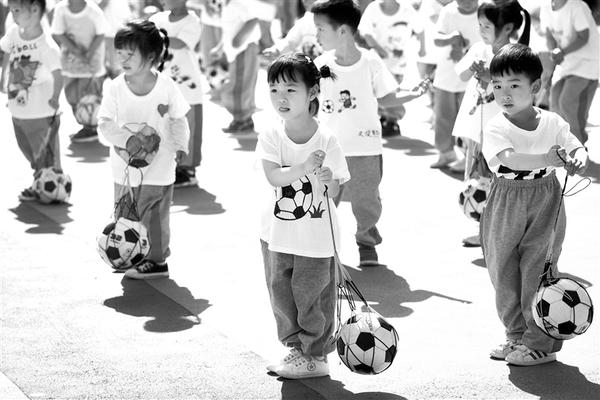 5月21日,孩子们参加网兜球游戏。当日,浙江省湖州市长兴县中心幼儿园举办以“快乐足球”为主题的校园“足球嘉年华”活动。该园学生和家长、老师一起参加了足球操、网兜球、带球跑等趣味足球活动。新华社发