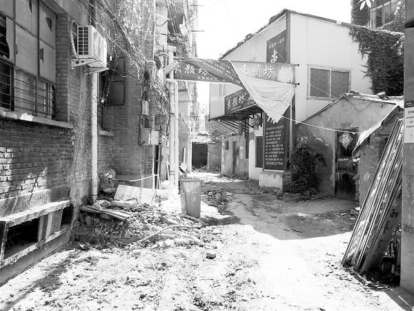5月23日上午,记者来到七一路和中州大道交叉口附近市民反映的楼院,发现现场确实破旧不堪(右图)。该楼院的过道上全是破碎砖块和建筑垃圾,一些管道裸露在地上,地上的窨井盖破损严重,有的用破木板遮挡。过道两侧还有一些拆迁留下的废旧物,过道上面是凌乱的电线和破旧广告牌。