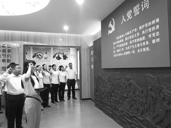 在讲解员的引导下,大家参观了廉政展厅。廉政展厅由“反腐历程、古廉今鉴、清廉家风、创新实践、警钟长鸣、砥砺前行”六大板块组成,展现了古今中外的廉政思想、反腐举措,老一辈无产阶级革命家、新时期党的领导干部的感人事迹。最后,大家在该行负责人张永胜的带领下,重温了入党誓词(如图)。