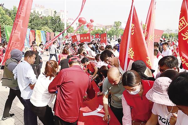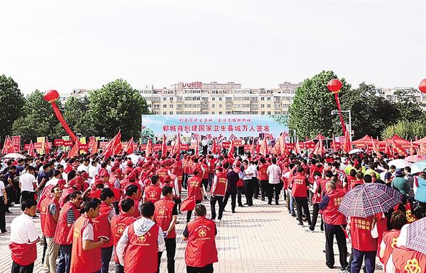 活动现场,万名参会人员在“创建国家卫生县城 建设美丽新郸城”巨型条幅上郑重签名承诺;参会人员随后排成整齐队伍,沿新华路等县城主干道参与“创卫”万人游行活动,倡议全县人民共同参与,汇聚“创卫”磅礴力量。