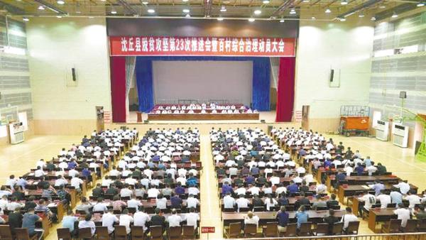本报讯 (记者 韦伟 文/图) 5月26日,沈丘县召开脱贫攻坚第23次推进会暨百村综合治理工作动员大会(如图)。会议要求,要认真学习贯彻习近平总书记关于脱贫攻坚工作的重要论述,进一步强化以脱贫攻坚统揽全县经济社会发展全局的工作理念,扎实开展脱贫攻坚巩固提升专项行动和百村综合治理工作,稳步推进驻村第一书记及队员有序轮换,进一步动员全县上下统一思想、提高认识,重整行装再出发,咬定青山不放松,确保高质量完成年度脱贫攻坚任务,全面打好打赢脱贫攻坚战。
