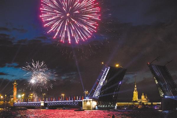5月27日,俄罗斯圣彼得堡燃放烟花庆祝建城316周年。