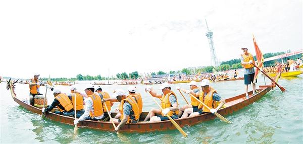5月29日,由河南省体育局、周口市人民政府主办的“龙行中原”第二届河南省全民龙舟大赛(周口赛区)暨2019年周口市第六届中华龙舟赛在沙颍河开赛。33支龙舟队将开展为期3天的水上竞技角逐。在开幕式上,还进行了舞龙、翎船捕鸭、航模、水上飞人等项目表演,让观众过了一把瘾。 记者 孙安平 梁照曾 摄 (相关报道见今日五版)