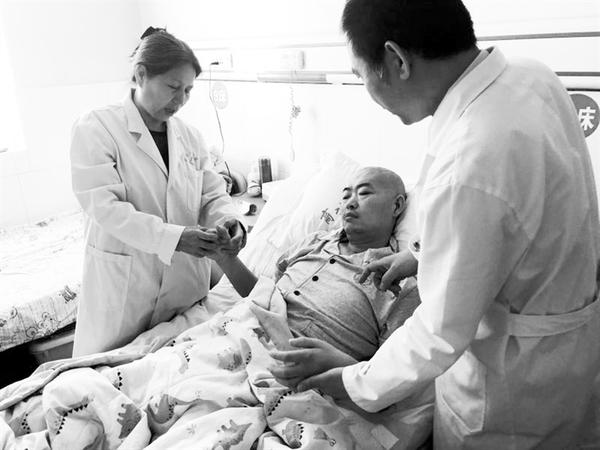 为进一步推动健康扶贫工作深入开展,让更多的患者享受到优质医疗服务,5月23日上午,省人民医院专家到商水县人民医院开展义诊活动。图为专家到病房为患者检查身体。 记者 郭怡晨 通讯员 崔国林 摄