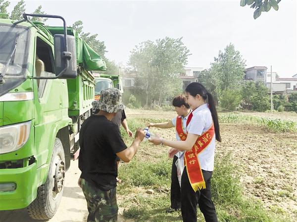 项城农商银行秣陵支行工作人员到田间地头宣传“夏粮贷”等金融产品,并为农户、农机作业人员送上纯净水。