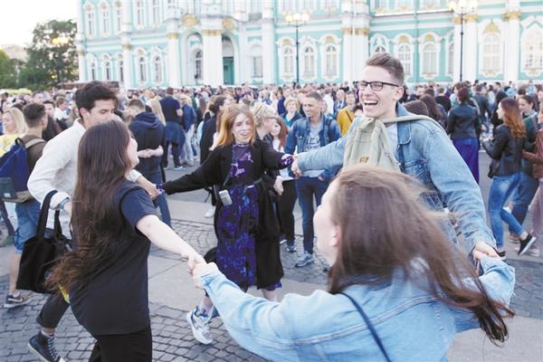 在俄罗斯圣彼得堡,人们在冬宫前的广场上欢庆“红帆节”。