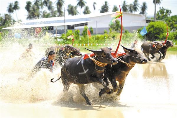 7月13日,在泰国春武里府赛牛节上,参赛者驾驭水牛参加比赛。当日,泰国春武里府举办盛大的赛牛节。春武里曾是泰国东部的商品集散中心,当地的赛牛节因水牛贸易而兴起,同时也为了庆祝稻米的丰收。新华社发