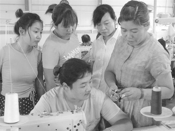 7月15日,商水县舒庄乡返乡创业标兵、县人大代表王荀(右一)向新员工指导毛绒玩具加工技术。近几年来,王荀在当地人大、工商联等部门支持下创办剑涵毛绒玩具有限公司,下设4个玩具厂,每年为400多名农村留守妇女和60名贫困家庭人员提供就业岗位,对孩子小、家庭困难不能离家的农村留守妇女直接把机器安装到家里,让她们不出家就能打工挣钱,人均月工资3000多元。乔连军 摄