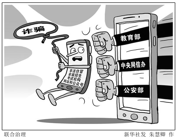 记者7月19日从教育部获悉,近日群众反映个别网站、微信公众号仿冒有关省级招生考试机构网站和微信公众号,发布有关高考的各类信息,其中含有虚假、诈骗等内容。针对这种情况,教育部、中央网信办、公安部联合治理非法仿冒省级招生考试机构网站和公众号。新华社发