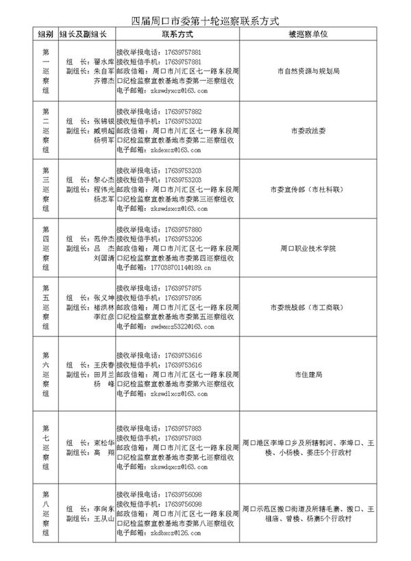 市委巡察组进驻时间为7月17日-8月30日。期间,市委各巡察组均开通并公布接收举报电话、接收短信手机、邮政信箱、电子邮箱。受理时间为工作日上午8:00-12:00,下午15:00-18:00,巡察结束后,信访渠道自行关闭。(附四届周口市委第十轮巡察联系方式)