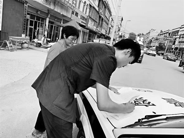 7月23日, 鹿邑县人民法院观堂法庭干警冒着高温酷暑到王皮溜镇送法律文书。法院干警身穿制服在烈日下工作,衣服上留下一圈汗渍。