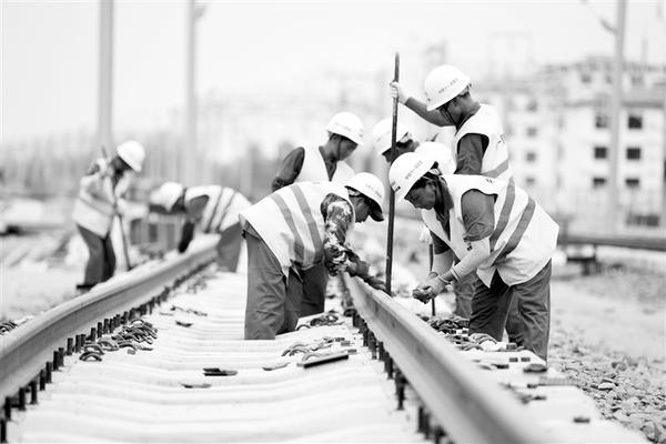 7月24日,中铁十一局施工人员在进行铺轨作业。当日,商合杭铁路合肥北段最后一对500米长钢轨在安徽阜阳西站铺设完成,标志着商合杭铁路合肥北段铺轨贯通。新华社记者 刘军喜 摄