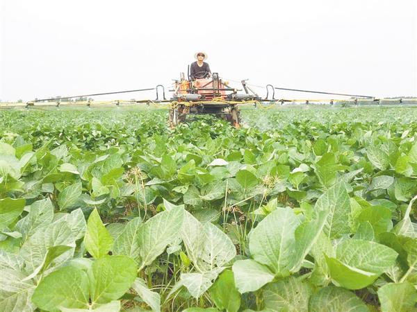 7月26日,在商水县郝岗镇家庭农场李喜粮高产大豆示范田,一农民正驾驶大型机械施药。返乡青年李喜粮流转1200多亩土地,创办家庭农场,发展高效农业,并积极吸纳贫困户加入家庭农场,带动贫困户增收。