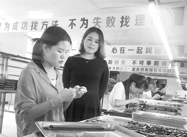 河南双晨电子科技有限公司去年落户西华县大王庄乡刘老家村后,生产线安装绕线机、点焊机、包装机等近50台,产品广泛用于液晶显示屏、计算机、数码相机、医疗设备、汽车等,目前已安置群众就业50余人,其中贫困户近20人,人月均收入3000多元,让村民在家门口实现就业增收。图为该公司总经理在生产车间了解工人收入和家庭生活情况。