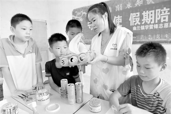8月16日,在南昌县幽兰镇新庄小学,志愿者和留守儿童一起进行手工制作。当日,江西省南昌市南昌县幽兰镇开展“守护天使 假期陪童”主题活动,志愿者们组织部分当地留守儿童来到新庄小学,分组进行手工制作和团队游戏体验,培养孩子们的团队协作和沟通的能力。