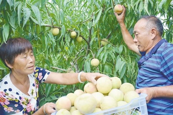 近年来,商水县积极引导农民工返乡创业,通过流转土地种植优质杂果,有效增加了农民收入。图为9月14日,商水县平店乡海子涯村“晨昱家庭农庄”优质杂果基地示范户王国荣、胡秀莲采摘优质鲜桃。