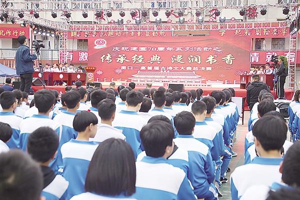 从书声琅琅的晨读到斗志昂扬的宣誓,从激情四射的出操到气氛热烈的讨论,从学风浓厚的课堂到锲而不舍的课后,从洁净舒雅的环境到整洁朴素的内务,从站立规范的认真读书到熄灯息声的静谧速眠,从捡拾垃圾的弯腰精神到自觉有序的集体意识……置身二高校园,无处不在的激情和感动洋溢在我们的周围。回首近年来周口市第二高级中学的崛起历程,传承与创新并辉,艰辛与拼搏共映。一路走来,二高人用自强不息、励精图治、始终不渝的汗水谱写了一曲又一曲激昂奋进的华章。