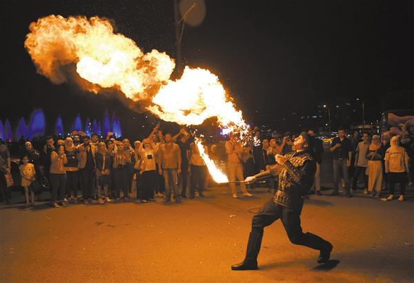 9月21日,在叙利亚大马士革,一名艺人进行喷火表演。叙利亚民众21日举行各类活动纪念国际和平日。2001年,联合国大会通过决议,将国际和平日固定为每年的9月21日。新华社发