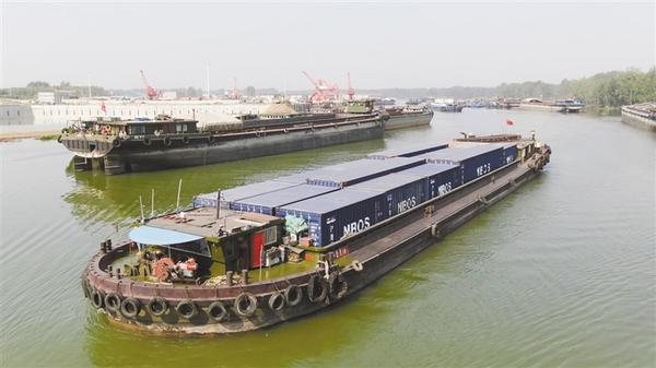 9月24日上午,周口港至太仓港点对点集装箱精品航线开航仪式在周口中心港码头举行。图为载满集装箱的货船缓缓驶离周口港码头。