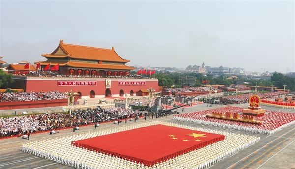 雄壮的军乐声中,习近平乘车沿着宽阔的长安街,依次检阅15个徒步方队、32个装备方队。近15000名受阅官兵整齐列阵、英姿勃发,580台受阅装备在阳光下熠熠生辉。这是中国特色社会主义进入新时代的首次国庆阅兵,也是共和国武装力量改革重塑后的首次整体亮相。