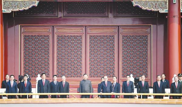 上午9时57分,在欢快的乐曲声中,习近平等党和国家领导人来到天安门城楼主席台,向广场观礼台上的各界代表挥手致意。全场爆发出雷鸣般的掌声。
