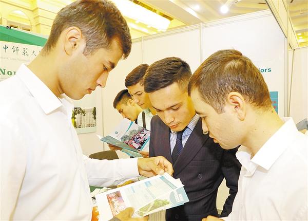 10月8日,在乌兹别克斯坦首都塔什干,乌兹别克斯坦学生在“2019中国高等教育展”上查阅招生资料。