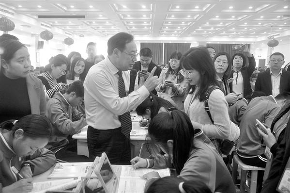 10月19日,周口市文昌中学“学本智慧新课堂”引来近千名“取经人”。该校向教育同仁展示了互联网环境下信息化教学设备在课堂上如何与“学本理念”相融合。中国教育科学研究院教师教育研究中心教授韩立福到会指导,并给予周口市文昌中学高度评价。图为韩立福向观摩人员讲授“学本智慧新课堂”教学方法。