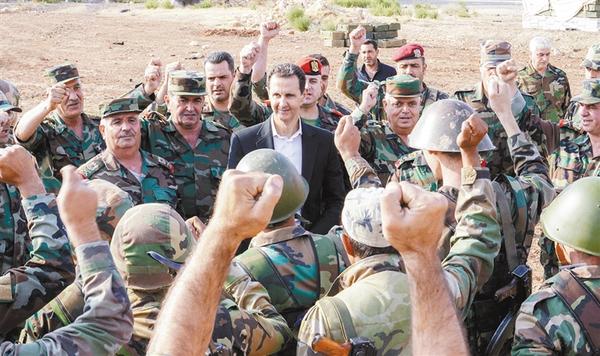 10月22日,在叙利亚伊德利卜省哈比特镇,叙利亚总统巴沙尔·阿萨德(中)接见政府军人员。据叙利亚通讯社22日报道,叙总统巴沙尔·阿萨德当天前往叙西北部伊德利卜省前线,在该省哈比特镇接见政府军人员。新华社发