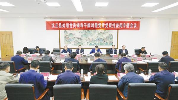 本报讯 (记者 韦伟 文/图) 10月29日,沈丘县召开处级党员领导干部对照党章党规找差距专题会(如图)。皇甫立新、刘国庆、贾庆伟、殷晓春、李子顺等在家的县四个班子领导及副处级以上干部出席会议。市委第二巡回指导组组长魏新建及指导组成员到会指导。