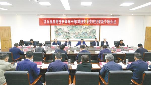 本报讯 (记者 韦伟 文/图) 日前,沈丘县召开处级党员领导干部对照党章党规找差距专题会。皇甫立新、刘国庆、贾庆伟、殷晓春、李子顺等在家的县四个班子领导及副处级以上干部出席会议(如图)。市委第二巡回指导组组长魏新建及指导组成员到会指导。