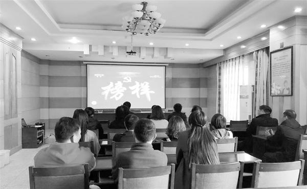 农行西城支行为使主题教育取得实效,组织全行党员观看专题教育片《榜样4》。通过观看节目中优秀党员的感人事迹,激发党员的看齐意识、责任意识,激励大家充分发挥党员先锋模范作用,以更加饱满的热情投入到服务客户之中。图为观看《榜样4》现场。 谭冰兰 李勤 摄