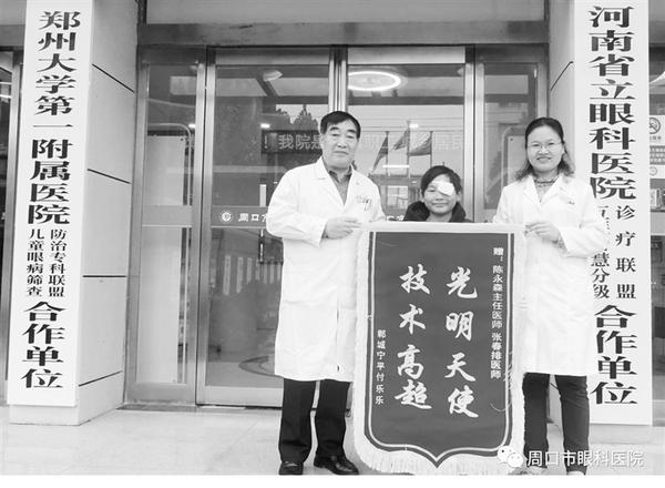 “谢谢医院的叔叔阿姨们,我的眼睛康复了。” 11月18日,患者付乐乐捧着写有“技术高超、光明天使”字样的锦旗,在邻居的陪护下到周口市眼科医院,向医护人员表示感谢。
