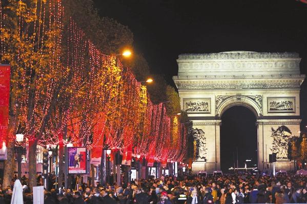 11月24日,在法国巴黎,人们在香榭丽舍大街上参加点灯仪式。