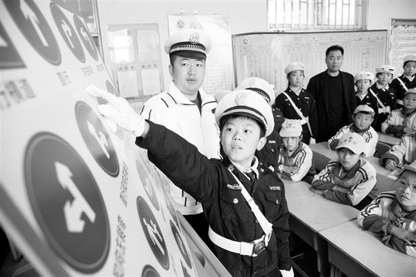 12月1日,东皋埠小学“小小交警队”王嘉瑞(前)在为同学们介绍交通标识。第八个“全国交通安全日”即将到来之际,山东省青岛市公安局即墨分局交警大队省高新区值勤中队来到辖区东皋埠小学,开展“守规则除隐患,安全文明出行”主题安全教育活动,向孩子们讲解交通安全知识,让孩子们从小养成良好的交通出行习惯。新华社发