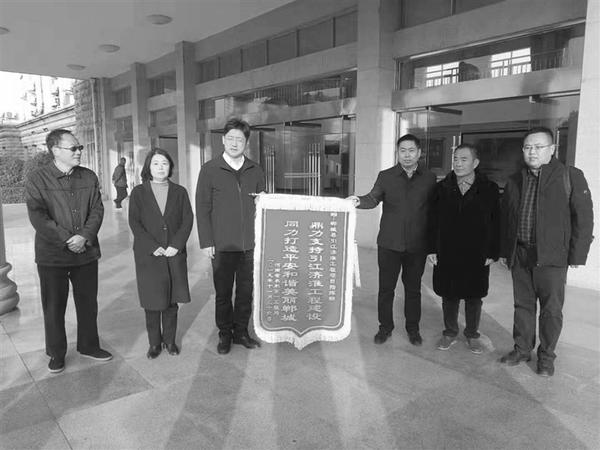 12月12日上午,河南省引江济淮工程公司副总经理刘渊将一面印有“鼎力支持引江济淮工程建设 同力打造平安和谐美丽郸城”的锦旗送给郸城县委、县政府,以感谢郸城县委、县政府在引江济淮工程拆迁、施工等方面给予的大力支持。薛成洲 摄