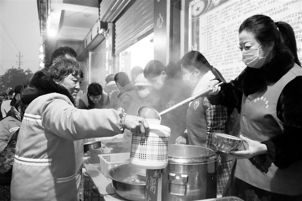 12月25日,项城市的志愿者一大早就在环城路爱心粥屋为环卫工人奉上暖暖的爱心粥,并免费发放御寒热敷贴,给城市美容师送去社会大家庭的温暖。 张永久 摄