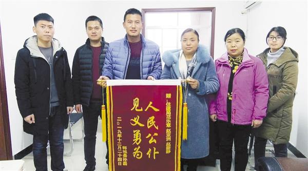 12月24日中午,一名女孩在郸城县人民公园观景湖边玩耍时不慎落水,县住建局职工范乐意和热心市民刘学军等人不顾湖水冰冷,奋不顾身跳入湖中将女孩成功救出。图为女孩家属为范乐意等人送锦旗。记者 徐松 摄