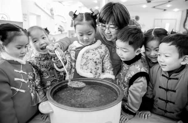 2019年12月31日,长兴县机关幼儿园的老师和孩子们一起将煮好的腊八粥装碗。在新年元旦及农历腊八来临前夕,浙江省长兴县机关幼儿园开展“祖孙同乐迎新年,腊八粥香暖人心”活动。老师、家长和孩子们一起了解腊八节的来历和习俗,认识制作腊八粥的主要材料和制作方法并一起制作腊八粥,感受中国传统文化的独特魅力,传承中华民族传统文化。新华社记者 徐昱 摄