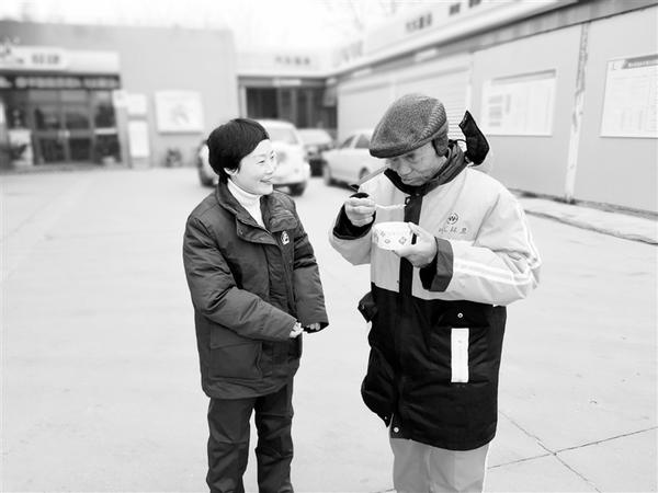 1月2日早上,郸城县“大爱乾坤”爱心粥屋,发起“一杯腊八粥、温暖一座城”活动,组织志愿者给环卫工人、交警、过往行人等免费发送爱心粥,传递温暖、传递关爱,让社会充满爱。图为志愿者在向环卫工人发送爱心粥。 记者 卢好亮 摄