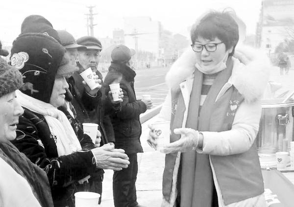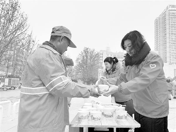 1月2日是中国传统节日腊八节,当天,市总工会、市慈善总会“爱心粥屋”组织志愿者走上街头,为市民免费发送腊八粥1200份。图为志愿者正在为市民盛腊八粥。 记者 窦娜 摄