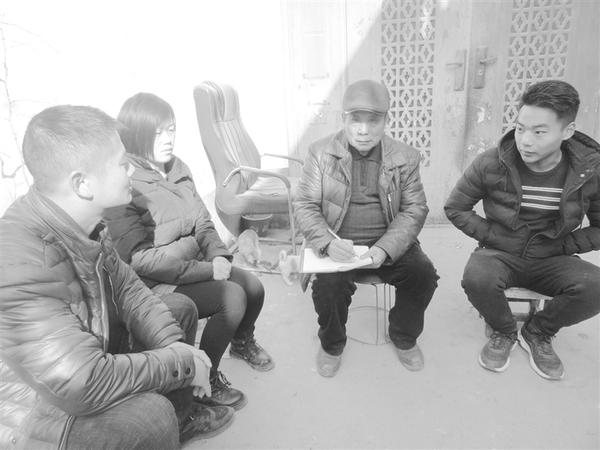 1月8日,商水县张庄乡赵棚行政村70岁的老党员、退休老校长、村级司法调解员李天道(右二)正在调解一起民事纠纷。李天道退休后被乡司法所聘请为村级司法调解员,从此热心调解工作,十多年来,先后调解邻里纠纷、家庭矛盾上千次,调解成功率达到98%,被村民们称为“金牌调解”,并多次受到当地司法部门表彰。通讯员 乔连军 摄