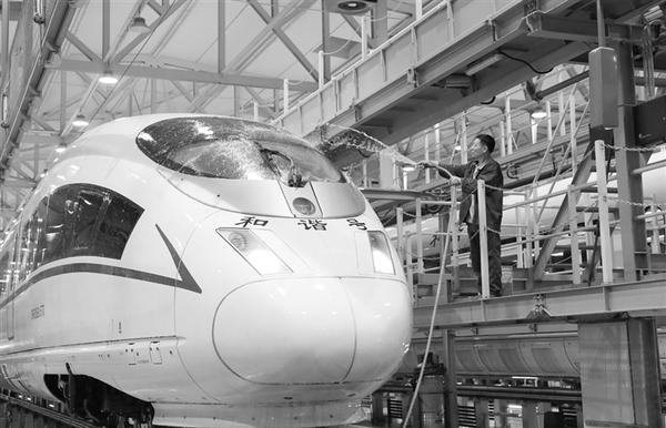 1月8日,在沈阳动车段沈阳北动车运用所,保洁人员对高铁列车进行外观清洗。2020年春运临近,中国铁路沈阳局集团有限公司沈阳动车段加强对动车组列车的检修整备工作,为即将到来的春运做好准备。新华社记者 杨青 摄
