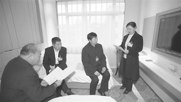 左图为陶金华代表在驻地征求其他代表的意见。 记者 王映 摄