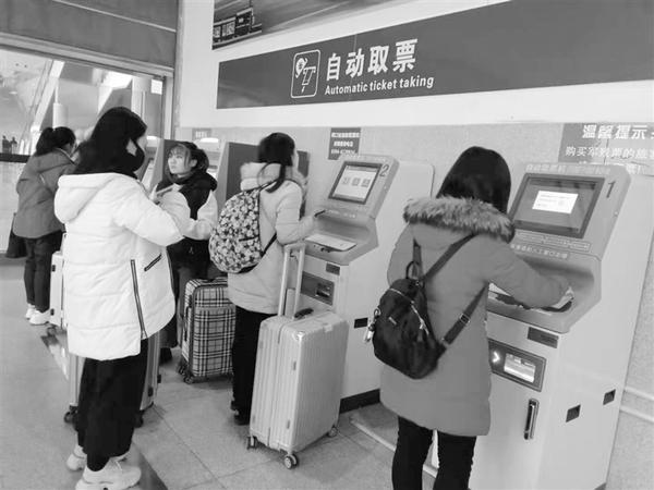 1月10日,在周口火车站,旅客在自助售票机前取票。
