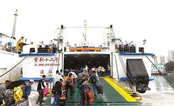 ④ 1月10日,在海口市秀英港轮渡码头,旅客登上“紫荆十二号”客滚船。