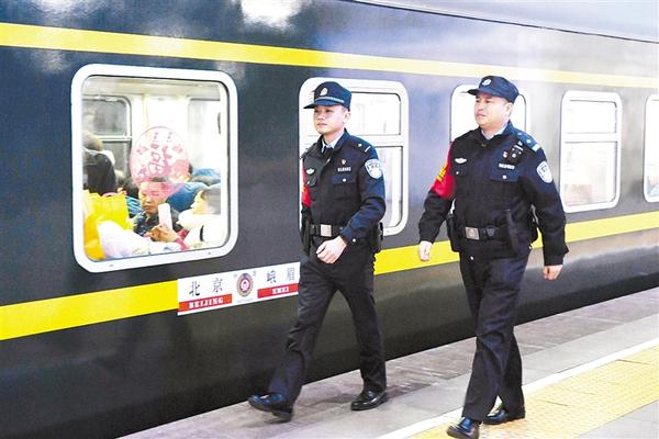 ⑤ 1月10日凌晨,在北京火车站,北京铁路公安处乘警在等候发车的K4291次列车外巡逻。