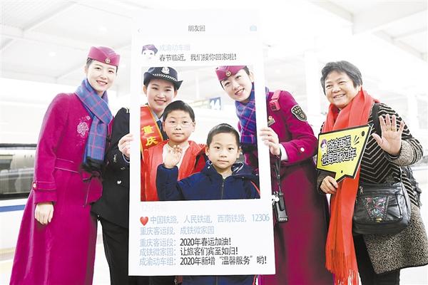③ 1月10日,搭乘G8504次列车的旅客与铁路工作人员在重庆北站站台上合影。