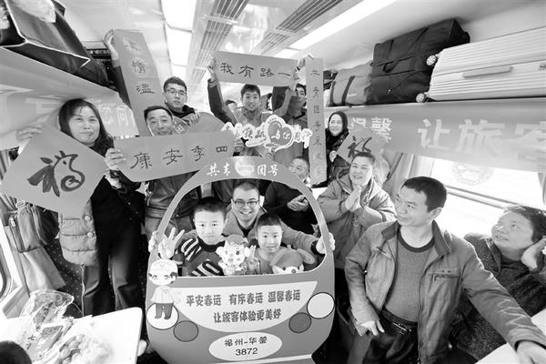 1月14日,3872次“共青团号”临时旅客列车乘务员与旅客在车上联欢合影。1月13日21时42分,3872次“共青团号”新增临时旅客列车从福州火车站开出。中国铁路南昌局集团有限公司福州工务段的30多名线路维修人员经过培训后,成为该趟列车的特殊乘务员。他们身着红色服装,为旅客提供热情服务。新华社记者 林善传 摄