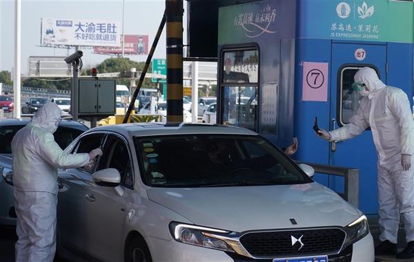 二、2月1日,在G42无锡出口,工作人员在检查车辆司乘人员身份信息。近期,江苏省在高速公路出口设置检查站,对司乘人员进行体温测量和身份信息检查。