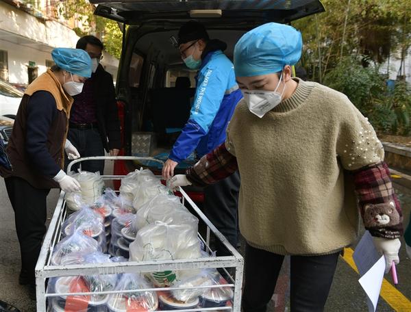 三、1月31日,在核对数量后,医院工作人员分批将盒饭运送给一线医护人员。1月31日是农历正月初七,处在新型冠状病毒感染的肺炎疫情中的湖北武汉没有了往日的喧嚣。已经有5年送外卖“工龄”的杨虎坐镇“饿了么”快递平台钟家村站点,不时接单、发单,同事们负责外送。1月31日下午,一份送500盒快餐的“大单”让他们不得不弃“双轮”换“四轮”——用搬家的货车运送盒饭。由饭店送到发热患者定点收治医院,路程仅有4公里,但非常时期,骑手们丝毫不能懈怠,测体温、戴口罩一样都不少。杨虎说:“这单500份的盒饭如果全由两轮的电动车送要用40辆左右,不现实,这个时期要避免密集的人员流动。”穿过狭窄的街巷,送饭车最终停在了武汉市第五医院食堂门前,杨虎和同事们协助卸车、清点、交接。“从大年初三开始,我们平台为武汉的医院平均每天免运费送餐1500份。在这里救死扶伤的白衣天使非常辛苦,疫情这么危急,这些单,免费送!”杨虎边干活边介绍。 新华社记者 李贺 摄